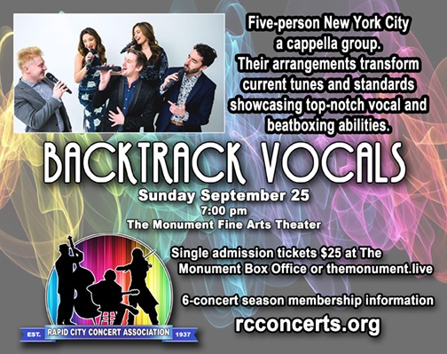 Brought to you by the Rapid City Concert Association, Backtrack Vocals is a 5-person New York City a capella group. Their arrangements transform current tunes and standards showcasing top-notch vocal and beatboxing abilities.
