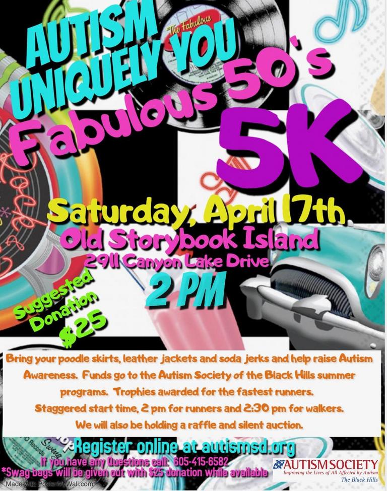 Bring your poodle skirts, leather jackets and soda jerks and help raise Autism Awareness. Funds go to the Autism Society of the Black Hills summer programs. Trophies awarded for the fastest runners.