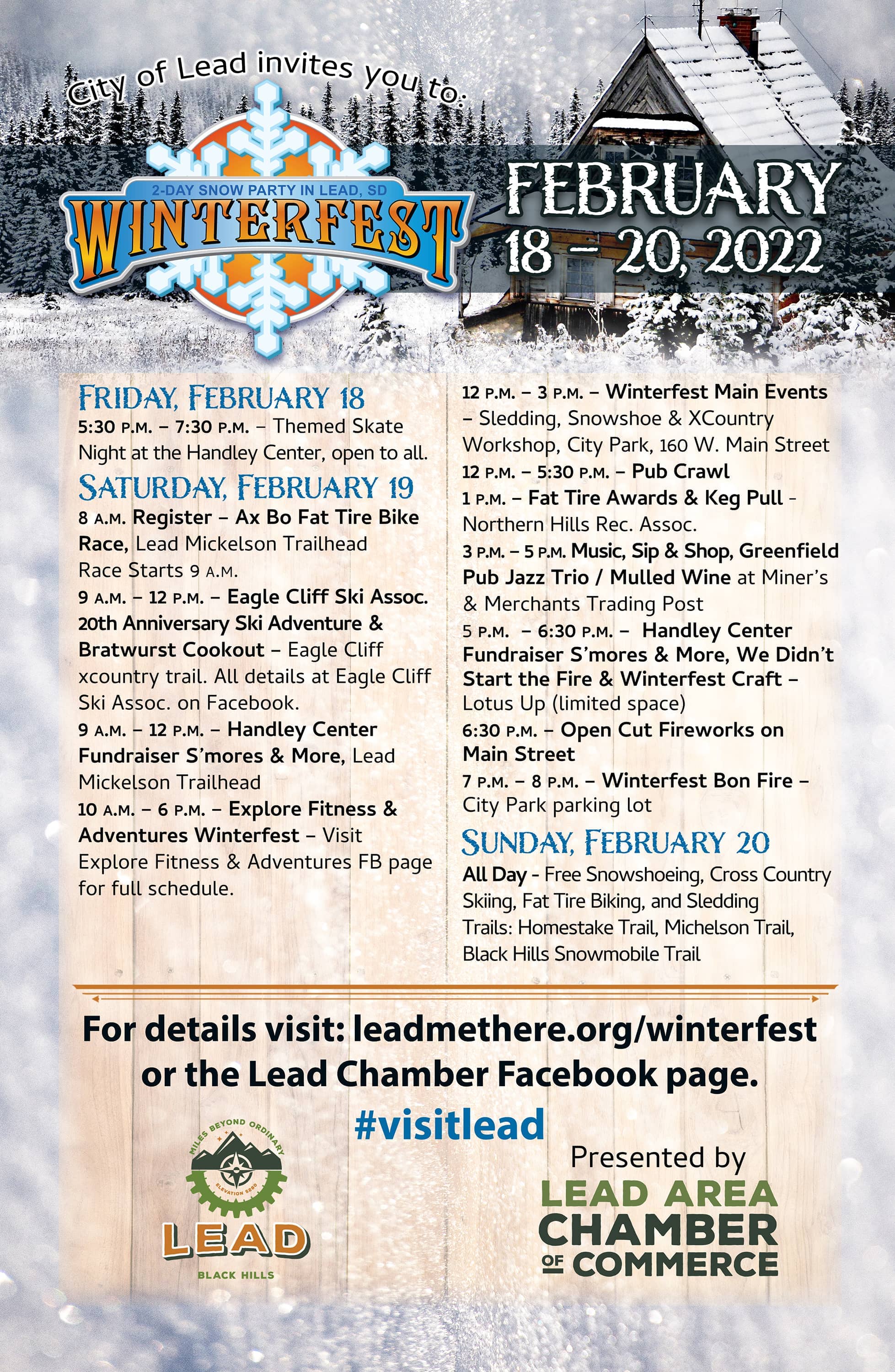 12pm to 3pm – Winterfest Family Fun at Manuel Brother’s Park: 160 West Main, Lead, SD; sledding, snowshoe and cross country ski workshop presented by Northern Recreation Association.